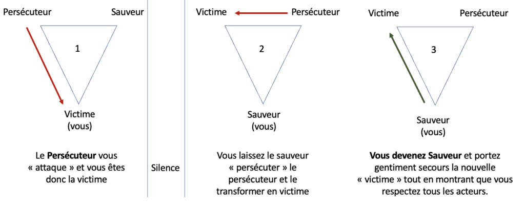 Et là encore, presque instantanément, quelqu’un d’autre, le « sauveur » va prendre la parole pour défendre la victime en contredisant le « persécuteur »…